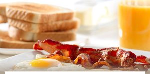 Eggs, Sausage, Hash Browns, Sweet, Toast, Juice, Coffee and Tea